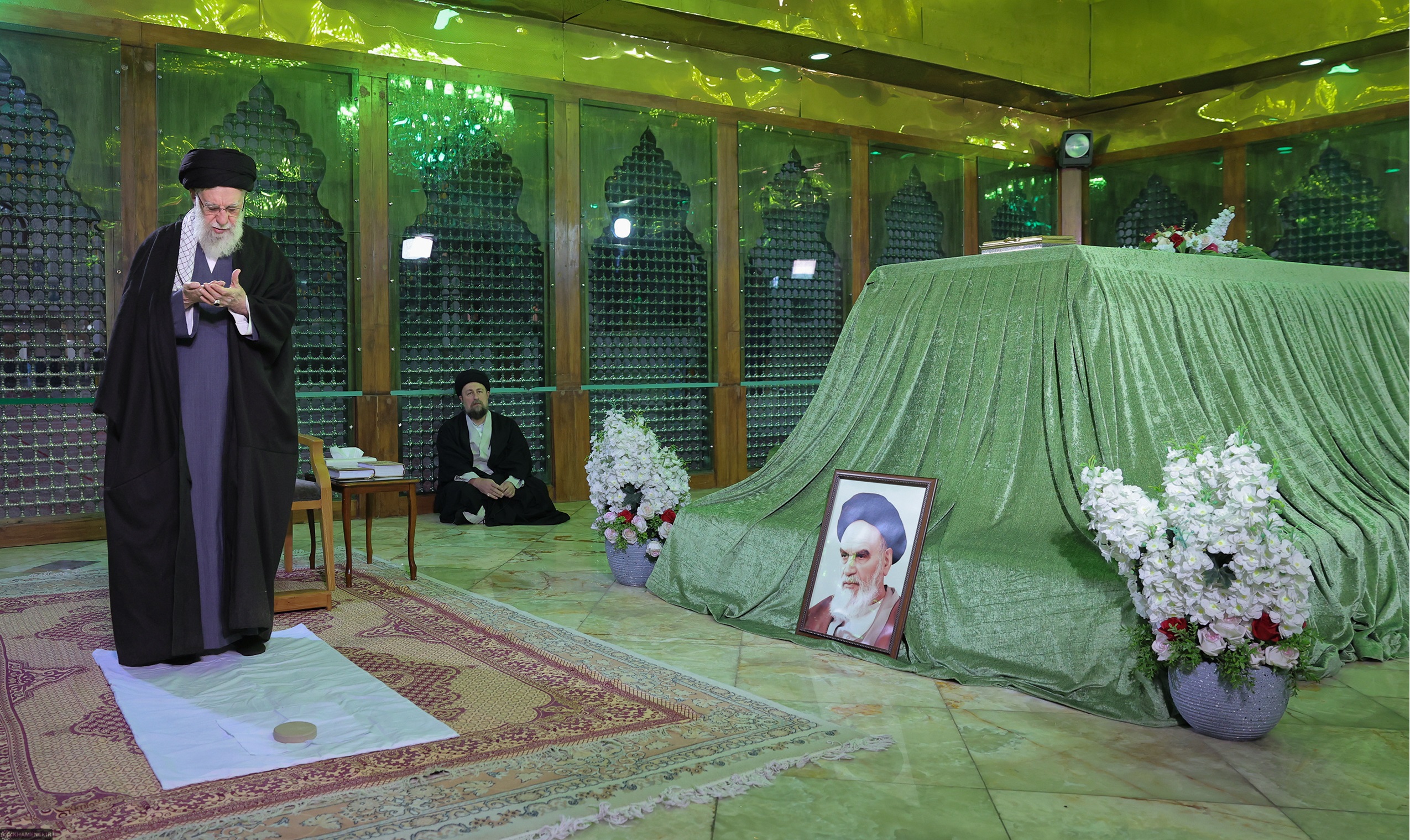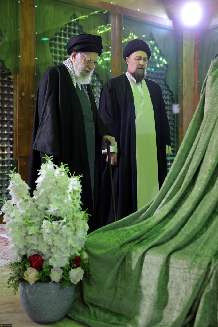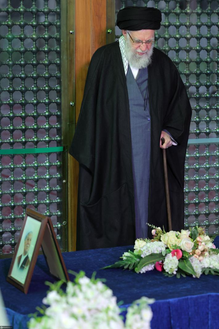 Его светлость аятолла Хаменеи, прочитав суру "Аль-Фатиха" и совершив намаз в мавзолее Имама Хомейни (да распространится на него милость Аллаха!), помолился о возвышении степеней великого Имама-муджахида и мучеников революции.